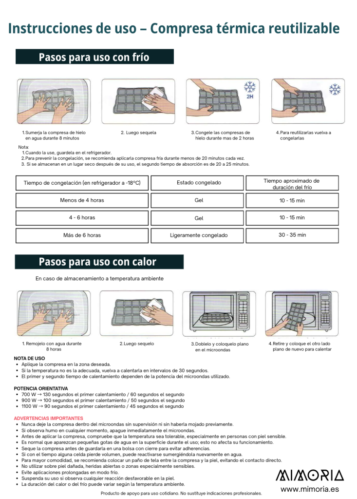 La Compresa Térmica Reutilizable de Frío y Calor MIMORIA es una solución práctica para quienes buscan una sensación agradable de calor o frescor en su rutina diaria. Su diseño flexible permite adaptarla con facilidad a distintas zonas del cuerpo, ofreciendo una aplicación cómoda tanto en casa como en momentos de descanso.